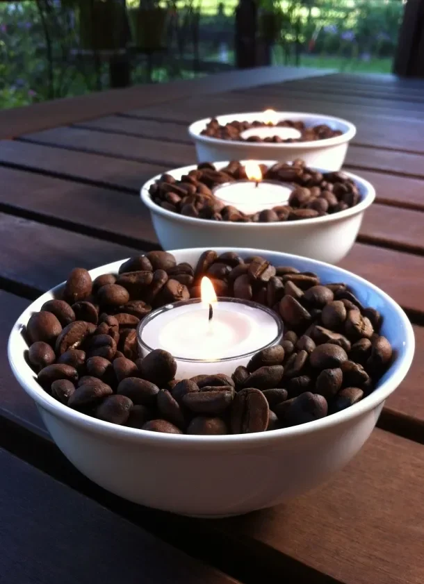 If you love the aroma of freshly brewed coffee, this one’s for you! Coffee bean candles fill your home with a cozy café-like scent while adding rustic charm. Simply mix coffee beans into melted wax or layer them around the edges of your candle jar.