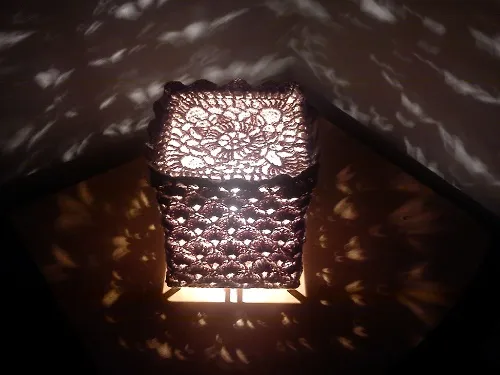 Decorate your home or office space with Japanese charm. This handcrafted light fixture uses ch, sc, dc, hdc, sl st, and tr stitches.