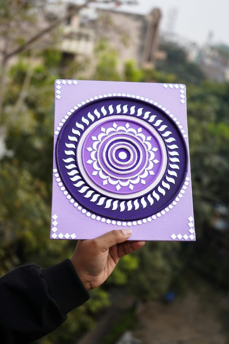 Transform your wall space with a large canvas mandala painting. Start with a base color background, sketch the central circle, and gradually expand with intricate designs. You can play with gold, metallic, or white outlines for a stunning aesthetic.